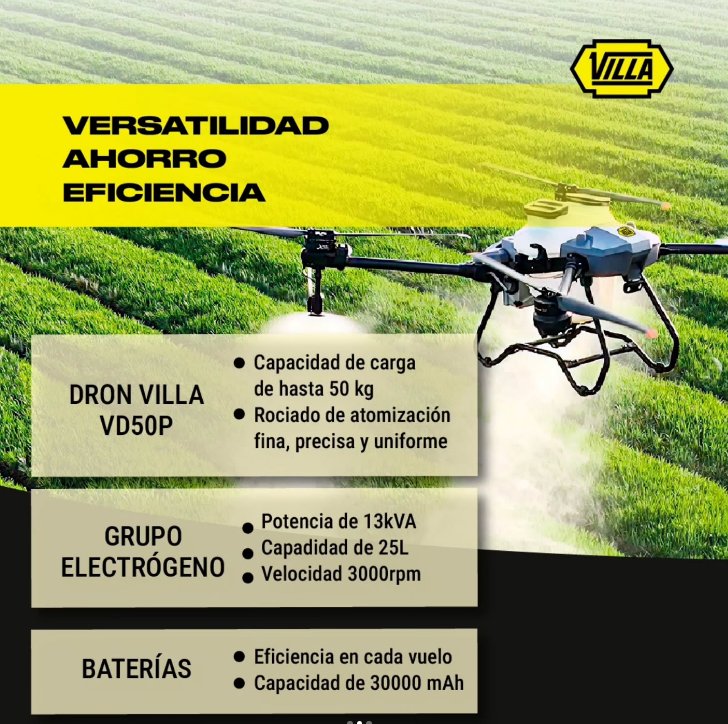 VILLA DRON 50P no es solo un equipo, es una herramienta de precisión diseñada para optimizar cada hectárea de su producción. Con una capacidad de carga de hasta 50 kg y un rendimiento de hasta 16 hectáreas por hora, este dron es la solución ideal para fumigación y fertilización de grandes extensiones.