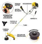 Motor 2 Tiempos 33 cc. 1,2 HP. Balasto 28 mm. Recto Cabezal semiautomatico., Peso: 7 Kg. Semi Profesional. Cilindro tratado con Cromo para una mayor durabilidad. 12 Meses de Garantìa. Cuchilla de 3 puntas y Arnes Pro.